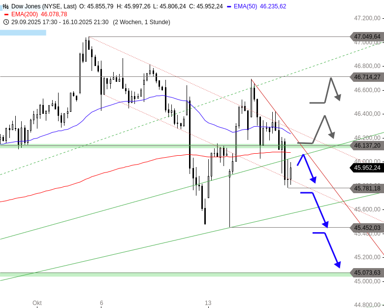 Zur gestrigen Eröffnung scheiterte der Dow Jones Index am Widerstand bei 46.450 Punkten und brach in der Folge an die Unterseite der früheren Trendkanalbegrenzung auf Höhe von 45.800 Punkten ein. In der Vorbörse kann sich der Index zwar weiter vom Tief lösen. Der Abverkauf des gestrigen Tages hat jedoch die Rally seit dem 14. Oktober gekontert und beendet.