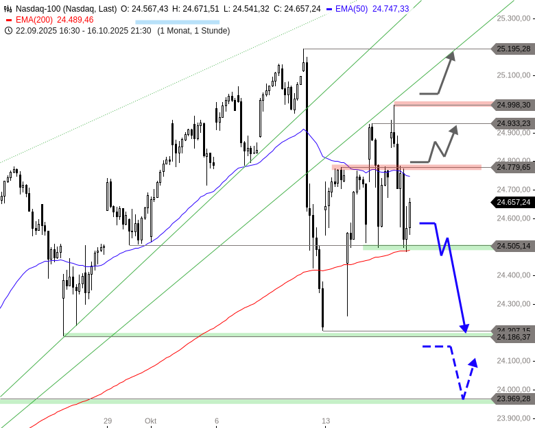 Erst oberhalb von 24.779 Punkten wäre den Bullen ein Befreiungsschlag gelungen und eine Erholung bis 24.880 und 24.933 Punkte möglich. Die 25.050-Punkte-Marke bleibt weiterhin die zentrale Barriere auf dem Weg zum Allzeithoch.