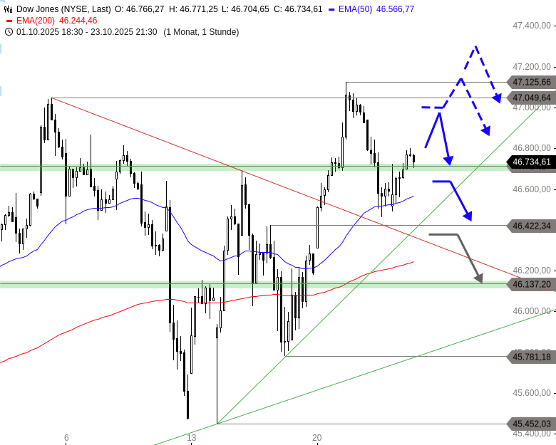 In einem ersten Schritt dürfte der Dow Jones jetzt oberhalb von 46.900 Punkten eröffnen und direkt den Widerstand bei 46.975 Punkten ansteuern. Wird dieser überwunden, könnte auch das Allzeithoch bei 47.125 Punkten, sowie später die Zielregion um 47.300 Punkten erreicht werden. Auf beiden Niveaus ist weiterhin mit einer deutlichen Korrektur zu rechnen.