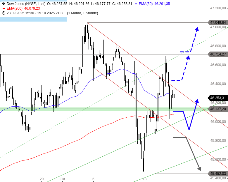 Sollte der Dow Jones nicht direkt über 46.450 Punkte steigen, droht ein zweiter Abverkauf unter den Support bei 46.137 Punkten. Dies würde einer späteren Fortsetzung der Rally seit dem 14. Oktober zwar nicht im Weg stehen, allerdings das Risiko einer Verkaufswelle unter die Trendlinienkreuzung bei 45.900 Punkten in Richtung 45.452 Punkte deutlich erhöhen.