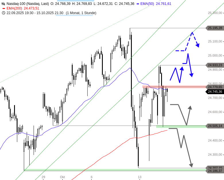 In der Vorbörse notiert der Index bereits wieder deutlich über der Hürde bei 24.779 Punkten und könnte damit ein weiteres Mal bis 24.880 und 24.933 Punkte klettern. An dieser Stelle wäre wiederum mit einer Korrektur zu rechnen, die unter 24.700 Punkte bis 24.505 und letztlich sogar schon bis 24.168 Punkte zurückführen kann.