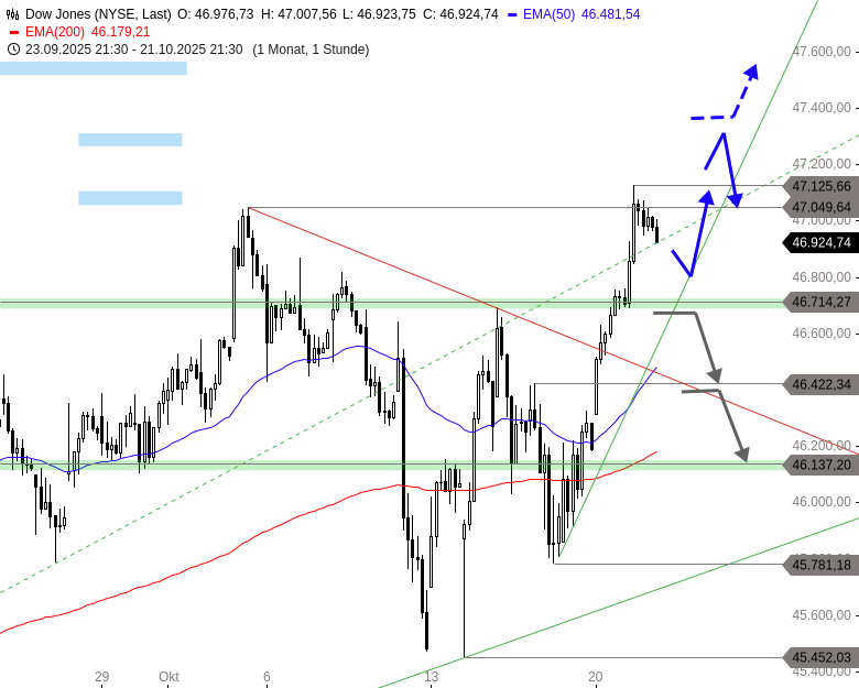Nach dem erfolgreichen Ausbruch über den Widerstand bei 46.714 Punkten sprintete der Dow Jones Index in der ersten Handelshälfte steil nach Norden und markierte mit 47.125 Punkten ein neues Allzeithoch. An dieser Stelle setzte eine leichte Korrektur ein, die bis zum Handelsschluss andauerte.