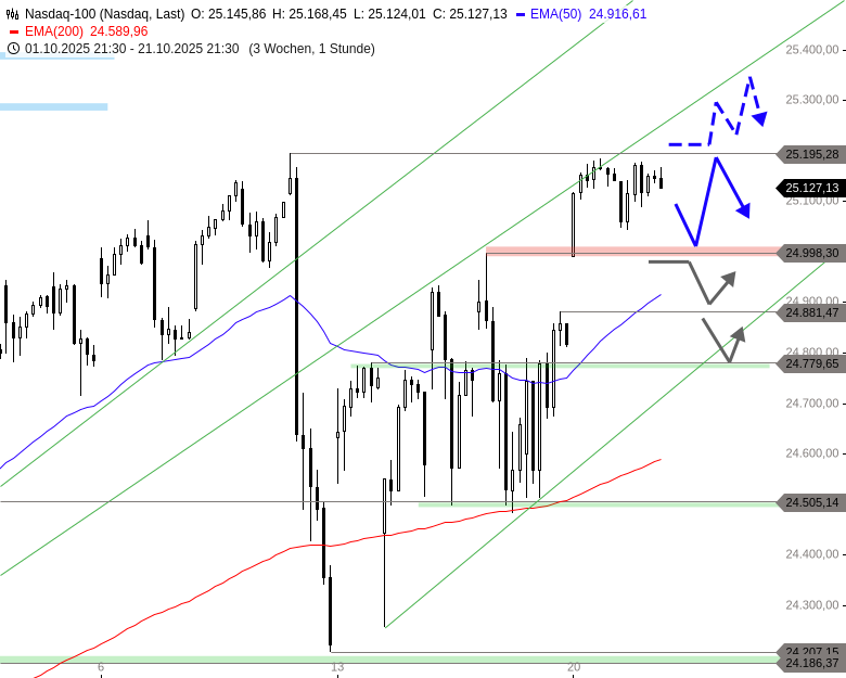 Sollte der verschachtelte Anstieg seit dem 13. Oktober tatsächlich das Aufwärtspotenzial des Index limitieren, dürfte es auch weiterhin bei einem Top bei 25.183 Punkten bleiben. Ausgehend von 25.050 Punkten könnte aber ein weiterer Ausbruchsversuch starten. Sollte dieser erfolgreich verlaufen, kann der Index bis 25.255 und 25.350 Punkte steigen.