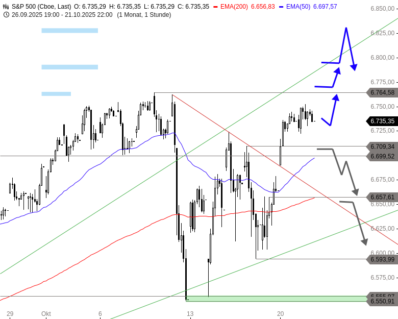 Solange der Index nicht wieder unter die vorherigen Hürden bei 6.724 und 6.709 Punkten fällt, ist mit einem direkten Anstieg an das Allzeithoch zu rechnen. Darüber dürfte der Kurs weiter bis 6.790 Punkte klettern, könnte dort jedoch abverkauft werden. Über der Hürde wartet mit 6.830 Punkten ein übergeordnetes Kursziel der Rally der letzten Monate.