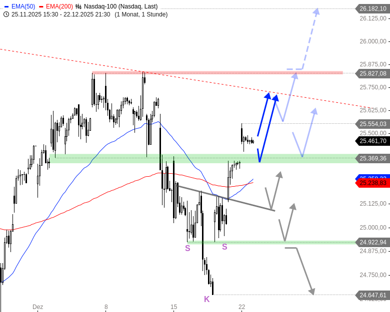 Im vorweihnachtlichen Handel werden keine großen Sprünge mehr erwartet. Prinzipiell wäre eine Trendfortsetzung gen Norden drin, wenn es über 25.490 geht. Bei 25.725 und 25.820 - 25.840 lägen die nächsten Zwischenziele. Zunächst könnte der Index könnte aber auch nochmal korrigieren und das gestrige Gap schließen, ggf. sogar noch etwas tiefer zu den beiden EMAs im Stundenchart zurücksetzen. Spätestens dort müssten sich die Käufer dann wieder zeigen. Kritischer wird es unterhalb von 25.090 Punkten.