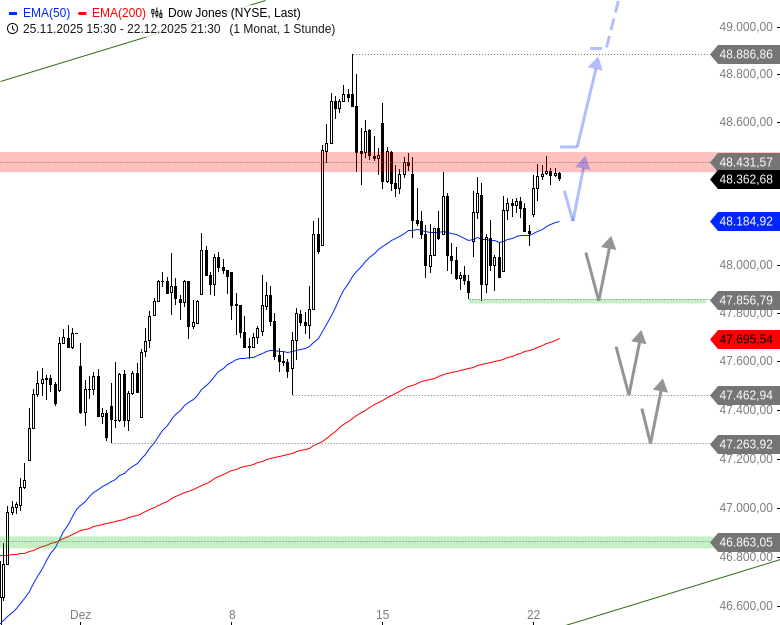 Neue Kaufsignale entstehen hier erst bei einer nachhaltigen Rückkehr über 48.470. Dann wäre der Weg frei für einen Rallyschub zum aktuellen Allzeithoch bei 48.887 und darüber hinaus zur Pullbacklinie bei rund 49.570 Punkten. Auf der Unterseite findet der Index bei 48.080 - 48.190 Punkten einen breiten Support, der möglichst nicht mehr unterschritten werden sollte. Ansonsten wären nochmals Abgaben bis 47.857 oder 47.700 Punkte einzuplanen. Darunter wäre das Zwischentief vom 10. Dezember bei 47.463 noch eine potenzielle Auffangzone.