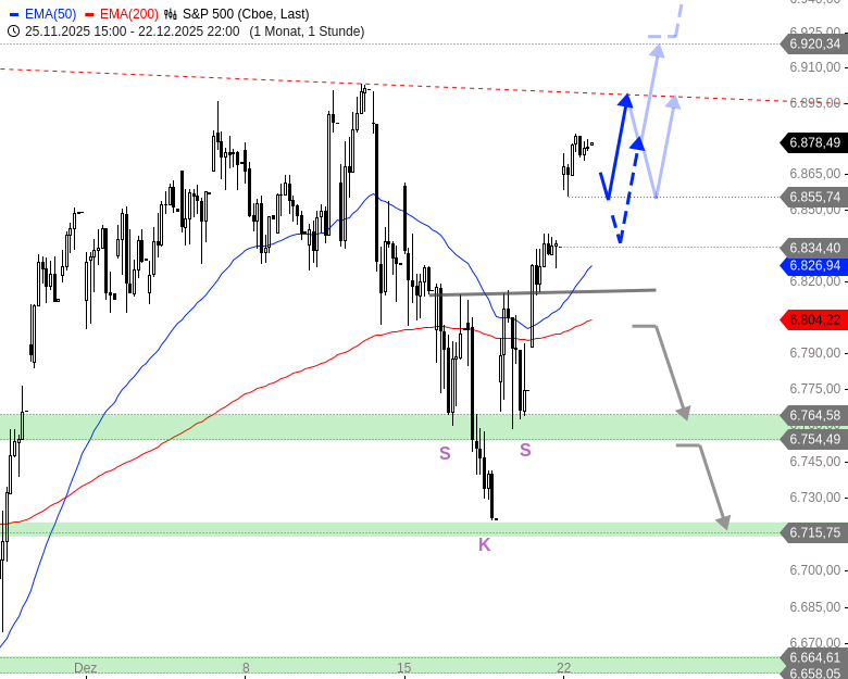 Kurzfristig wären Konsolidierungen auf hohem Niveau möglich, direkt oder nach dem Erreichen der Pullbacklinie bei rund 6.900 Punkten. Das gestrige Gap mit seinen Begrenzungen bei 6.856 und 6.834 wären gute Auffangmarken. Darunter wäre ein Test der alten Nackenlinie (schwarz) denkbar - viel tiefer sollte es möglichst nicht mehr gehen. Machen die Bullen hingegen wieder Druck, müsste jederzeit ein schnelles Erreichen des Allzeithochs und auch ein Ausbruch darüber eingeplant werden. Das Überraschungsmoment liegt klar bei den Käufern.
