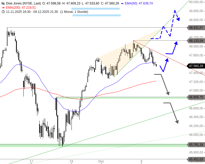 Zum Zinsentscheid der Fed heute Abend ist wieder mit erhöhter Volatilität zu rechnen. Bis dahin könnte der Dow ausgehend von einem Korrekturziel bei 47.400 Punkten wieder an die kurzfristige Abwärtstrendlinie bei 47.850 Punkten steigen. Sollte er dort nicht nach unten abprallen, wäre die Korrektur über der Trendlinie unterbrochen und ein Anstieg bis 48.133 Punkte möglich.