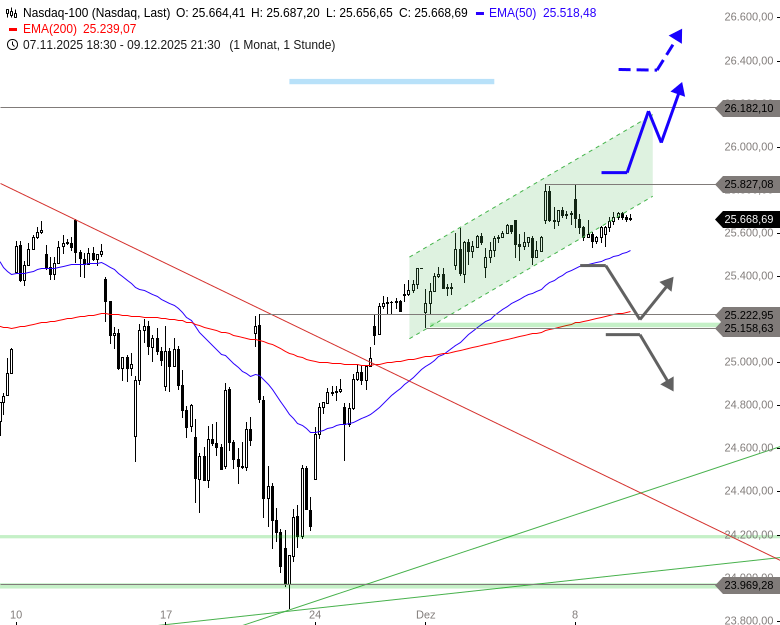 Für die Fortsetzung der Aufwärtstrendphase seit Ende November müsste der Index jetzt über 25.700 Punkte steigen. Ein Kaufsignal mit einem ersten Ziel bei 26.162 Punkten ergäbe sich dann bei einem Sprung über 25.827 Punkte.