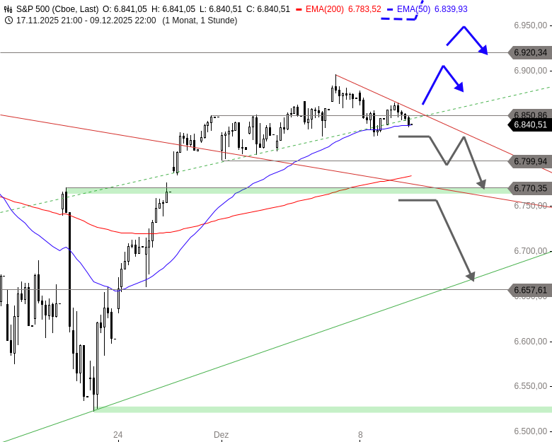 Auf der Unterseite gibt es dagegen wenig Spielraum. Schon unter 6.827 Punkten könnte eine Verkaufswelle bis 6.799 Punkte und darunter an den Support bei 6.770 Punkten starten. Sollte dort eine Erholung ausbleiben, dürfte der S&P 500 weiter bis an die zentrale kurzfristige Aufwärtstrendlinie auf Höhe von rund 6.670 Punkten einbrechen.