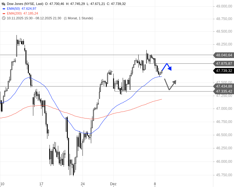 Der Dow Jones scheiterte am vergangenen Freitag am Widerstand bei 48.040 Punkten und bog am Montag in eine Konsolidierung ein. Diese endete am EMA50 Stunde.