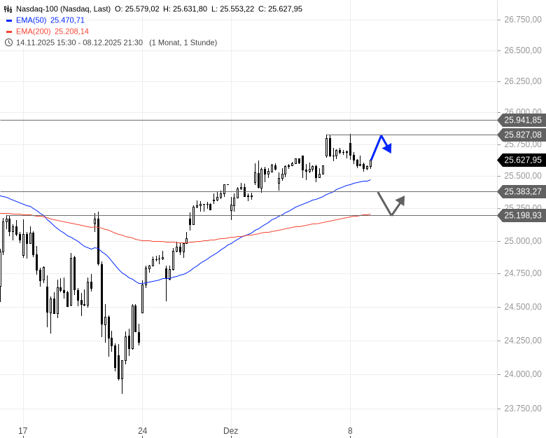 Viel wird heute auf NVIDIA ankommen. Kann die Aktie den nachbörslichen Zugewinn verteidigen oder gar ausbauen, könnte der Index sich wieder in Richtung 25.830 Punkte aufmachen. Darüber wären 25.942 Punkte erreichbar. Kippt der Nasdaq 100 dagegen weiter nach unten unten, könnte sich die Konsolidierung zeitlich wie preislich auf 25.383 und 25.199 Punkte ausdehnen.