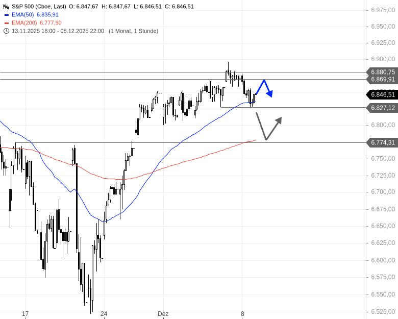 6.827 Punkten könnte man auch als kleinen Trigger für die Bären nennen. Fällt der S&P 500 unter diese Marke, könnte er bis 6.774 Punkte durchgereicht werden, wo neben einem wichtigen Ausbruchslevel auch der EMA200 Stunde wartet. Verteidigt der Index aber die gestrigen Tiefs, werden erneute Aufwärtsstrecken in Richtung 6.870 Punkte möglich.