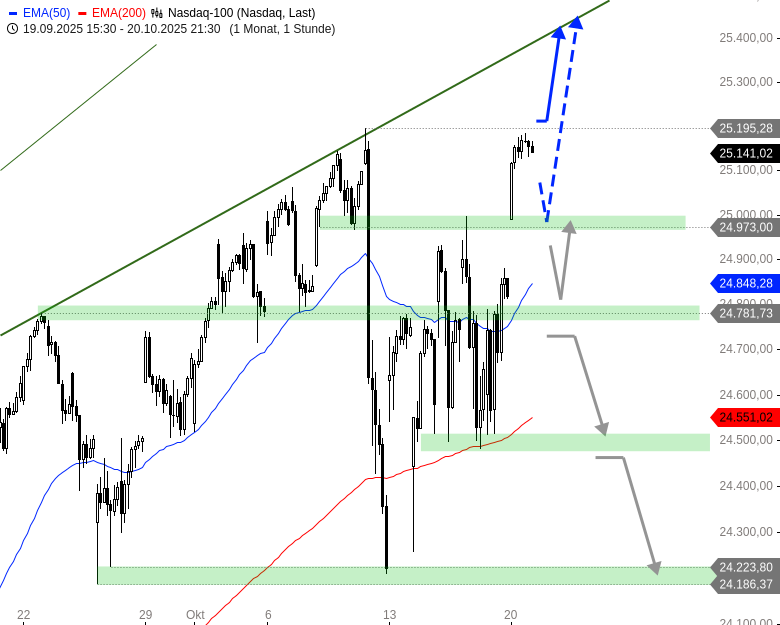 Die Käufer sind mit dem starken Wochenstart klar im Vorteil. Heute wären sowohl ein Ausbruch auf neue Hochs als auch eine Zwischenkorrektur auf hohem Niveau denkbar. Geht es nachhaltig über 25.200 Punkte, wäre Platz für eine Aufwärtswelle zur Pullbacklinie bei rund 25.420 - 25.460 Punkten. Im Idealfall bleibt das gestrige Gap offen, bei 24.970 - 25.000 Punkten liegt heute der zentrale Support. Ein signifikantes Abrutschen darunter könnte Abgaben bis 24.760 - 24.820 nach sich ziehen. Kritischer wird es unterhalb von 24.730 Punkten.