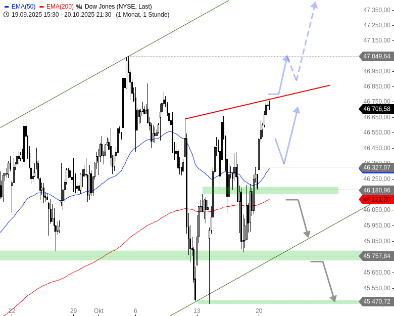 Kurzfristig ist unklar, ob der Index im Bereich der Pullbacklinie nach unten hin abprallt und eine größere Korrektur abspult oder ob die Käufer gleich einen Ausbruchsversuch nach oben hin starten werden. Kann der Index nachhaltig über 46.790 Punkte ansteigen, könnte das Allzeithoch bei 47.050 Punkten angesteuert werden. Mit Kursen unterhalb von 46.500 hingegen könnte eine tiefe Korrektur bis 46.300 - 46.340 oder 46.150 - 46.200 Punkte folgen. Erst unterhalb von 46.100 wären die Bären wieder im Vorteil.
