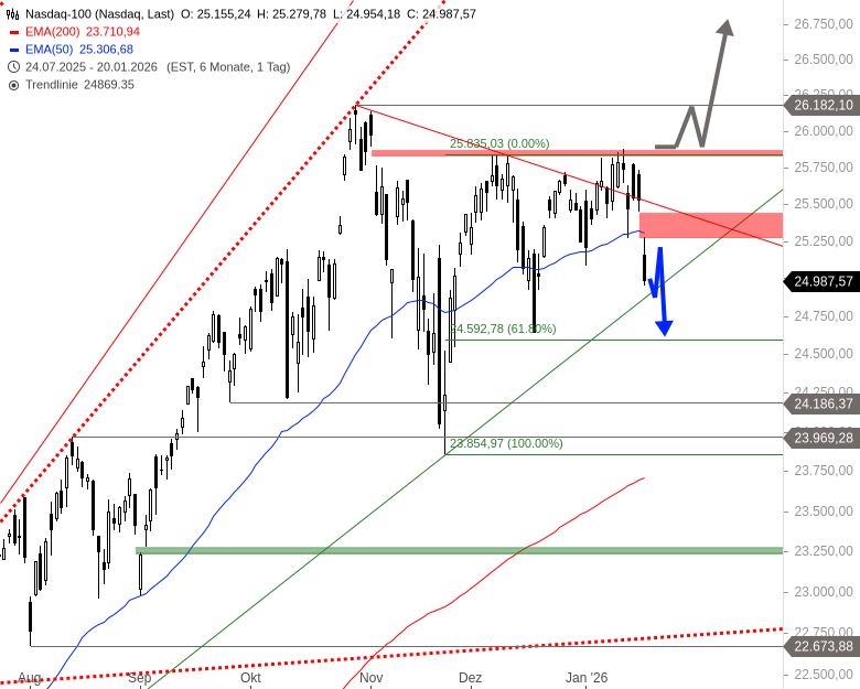 Mit dem gestrigen Rückfall riss der Nasdaq 100 ein Abwärtsgap zwischen 25.444 und 25.279 Punkten. Im Tagesverlauf setzte er die Korrektur fort und unterschritt erstmals seit dem 18. Dezember wieder die Marke von 25.000 Punkten. Der Index hatte seit dem 7. Januar versucht, seine seit Oktober laufende Korrekturbewegung zu beenden. Der Widerstand bei 25.835 Punkten erwies sich aber wiederholt als zu große Hürde – der Ausbruchversuch scheiterte mehrfach.