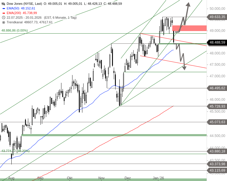 Solange die Unterstützung bei 48.431 Punkten nicht nachhaltig verletzt wird, kann die laufende Abwärtswelle als überschießender Pullback angesehen werden. Ein schneller Rebound über den vorherigen Widerstand bei 48.886 Punkten würde den Dow Jones wieder in Richtung 50.260 oder sogar 51.378 Punkte bringen. Ein stabiler Bruch nach unten dürfte hingegen weitere Rückgänge in den Zonen um 48.152, 47.606 und 47.182 Punkte nach sich ziehen.
