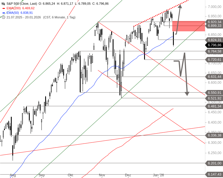 Auch beim S&P 500 wurde ein Abwärtsgap zwischen 6.925 und 6.871 Punkten gerissen. Anschließend gab der Index weiter nach, durchbrach seinen EMA50 bei 6.838 sowie die Unterstützung bei 6.824 Punkten. Damit entfernte er sich weiter von der oberen Pullbacklinie über die Dezemberhochs im Jahr 2025. Die Chartlage hat sich durch diese Bewegung spürbar eingetrübt und deutet zusätzliche Schwäche an.