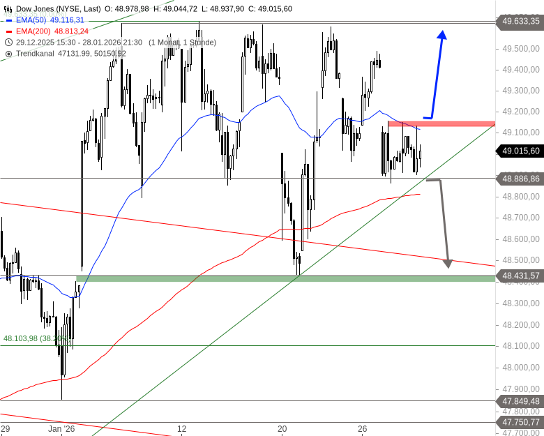 Der Dow Jones bewegte sich gestern wenig und konsolidierte auf dem alten Allzeithoch bei 48.886 Punkten. Diese kleine Seitwärtsphase wird auf der Oberseite von Widerständen zwischen 49.134 und 49.157 Punkten begrenzt. Nach dem Ausbruch am 07. Januar blieb zwar die Konsolidierung erhalten, dennoch zeigt sich das Gesamtbild tendenziell bullisch.