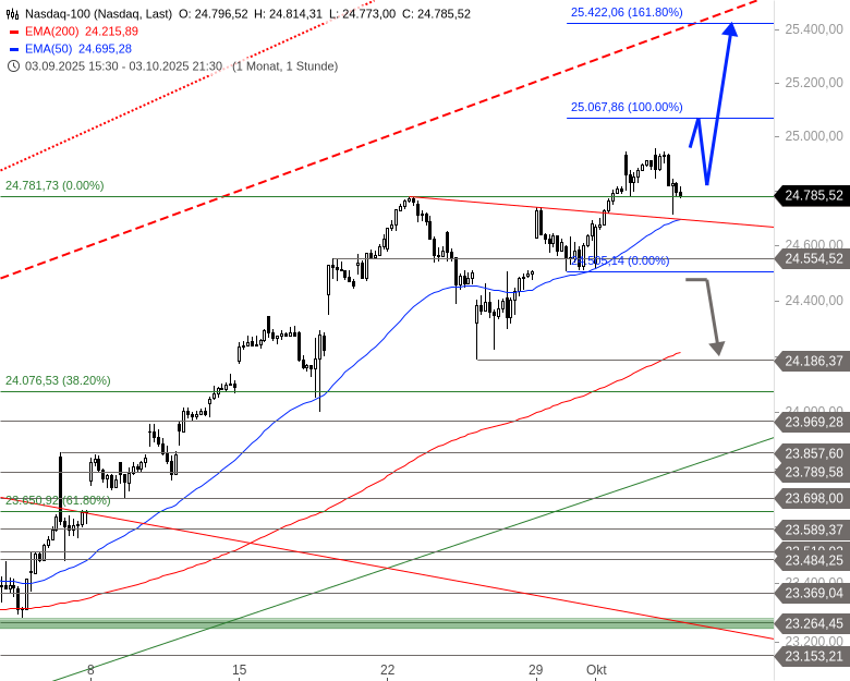 Nach dem Tief vom 7. April 2025 startete der Nasdaq 100 eine dynamische Aufwärtsbewegung, die bis Mitte Mai steil verlief. Danach ließ das Tempo nach, der Trend blieb aber intakt. Am 22. September markierte der Index ein Hoch bei 24.785 Punkten, fiel auf 24.186 Punkte zurück und brach am 1. Oktober über das bisherige Allzeithoch aus. Der RSI auf Tagesbasis fiel zuletzt aus der überkauften Zone.