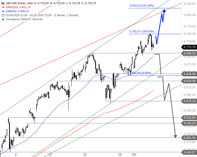 Solange der Unterstützungsbereich um das Allzeithoch vom 23. September 2025 hält, besteht weiteres Potenzial bis zur Pullbacklinie bei 6.799 Punkten oder sogar 6.818 Punkten. Ein Rückfall unter 6.645 bis 6.641 Punkte könnte hingegen eine Korrektur in Richtung des Hochs vom August bei 6.481 Punkten einleiten. Der Trend bleibt konstruktiv, auch wenn kurzfristige Rücksetzer möglich sind.