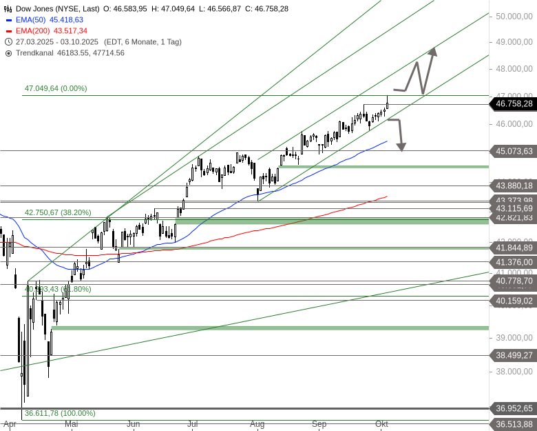 Mit dem Anstieg auf 46.714 Punkte wurden zuvor genannte kurzfristige Ziele erreicht. Der Rücksetzer vom neuen Hoch verleiht der Tageskerze einen leicht bärischen Charakter, ohne bereits ein Verkaufssignal zu liefern. Ein Rücklauf an die Ausbruchsmarke bei 45.073 Punkten ist jederzeit möglich. Das große Aufwärtspotenzial bleibt bestehen, solange diese Unterstützung hält.