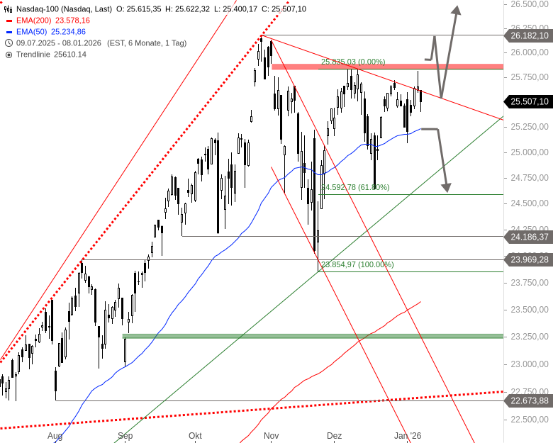 Ein Ausbruch über die Marke von 25.835 Punkten würde die Möglichkeit auf eine potenzielle Rally in Richtung 26.182 Punkte eröffnen. Kommt es zu einem Rückfall unter den EMA50, könnte der Index bis 24.592 Punkte nachgeben. Ob die Bullen tatsächlich Schwung aufnehmen oder ein Abpraller erfolgt, bleibt kurzfristig weiter offen.