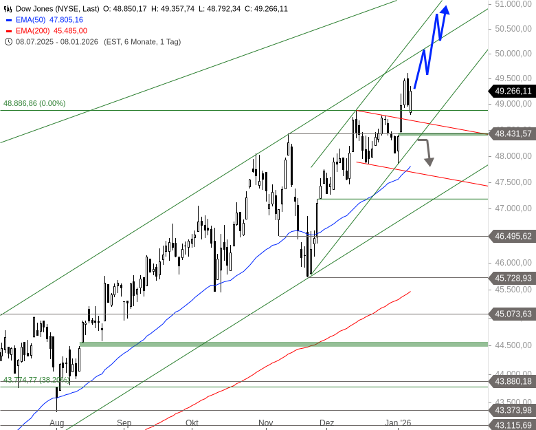 Der Dow Jones startete gestern etwas schwächer in den Handelstag, drehte aber zügig wieder nach oben. Bei Handelsbeginn fiel der Index kurz unter das alte Allzeithoch bei 48.886 Punkten zurück, konnte sich jedoch über dem Abwärtstrend, der seit dem 12. Dezember besteht, behaupten. Das Kaufsignal, das nach dem Ausbruch aus der Konsolidierung und über das alte Allzeithoch entstand, bleibt damit weiterhin gültig.