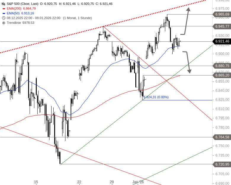 Der S&P 500 eröffnete gestern etwas schwächer und fiel zunächst auf 6.899 Punkte zurück. Nach dieser Bewegung erholte sich der Index und pendelte um das alte Rekordhoch aus Oktober 2025 bei 6.920 Punkten. Die kurzfristige Richtungsentscheidung steht somit noch aus und lässt beide Optionen, Aufwärts- oder Abwärtsbewegung, offen.