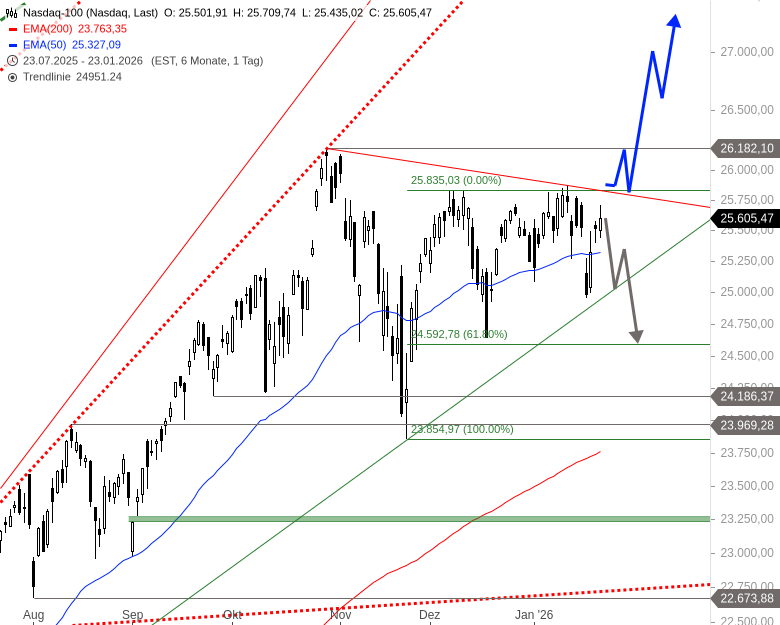 Der Nasdaq 100 markierte am 29. Oktober 2025 das Allzeithoch bei 26.182 Punkten, fiel danach auf 23.854 Punkte zurück und erholte sich bis auf 25.835 Punkte. In den vergangenen Wochen verharrte der Index in einer Seitwärtsphase. Anfang letzter Woche wurde ein neues Abwärtsmomentum kurzfristig aufgefangen und der EMA50 nach einem Abwärtsgap rasch zurückerobert.