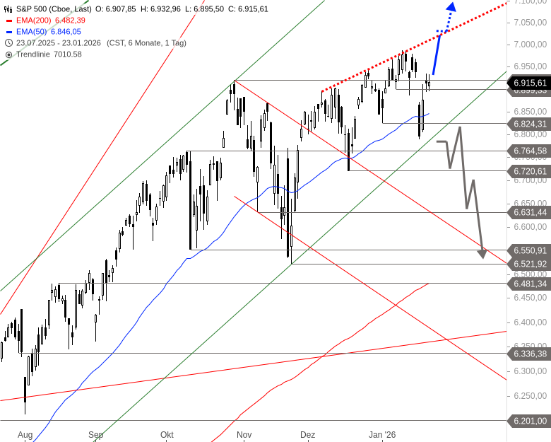 Der S&P 500 konnte nach dem Ausbruch am 28. November 2025 aus einer bullischen Flagge kaum Momentum aufbauen. Eine obere Pullbacklinie limitiert die Aufwärtsbewegung seit Dezember. Zu Beginn der Vorwoche drohte eine neue Verkaufswelle, die jedoch verhindert wurde und der Index zeigte kurzfristig Stabilität.