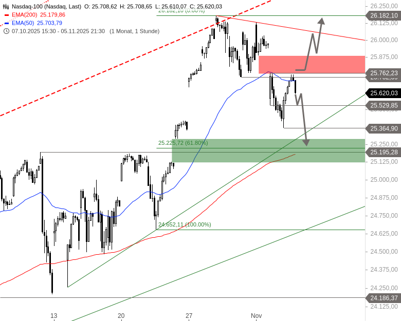 Da der Index gestern am Widerstandsbereich gescheitert ist, fehlt ein neues Kaufsignal, das einen Anstieg an das Allzeithoch ermöglichen würde. Erst ein Ausbruch über 25.762 Punkte würde ein solches Signal generieren. Solange dieser Ausbruch fehlt, herrscht weiter latent die Gefahr, dass der Nasdaq 100 auch im regulären Handel die Zielzone der Korrektur erreicht.
