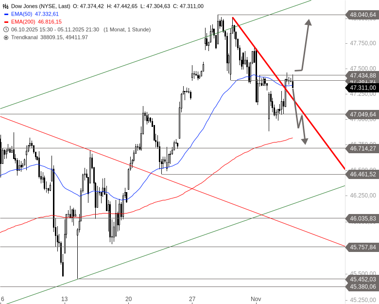 Solange der Index unter dem genannten Widerstandsbereich bleibt, ist ein Rücklauf in Richtung 46.731 Punkte weiter möglich. Erst ein Ausbruch über 47.434 Punkte würde ein Kaufsignal liefern und die Konsolidierung seit dem Allzeithoch beenden. In diesem Fall könnte der Dow Jones zunächst bis 48.040 Punkte steigen.