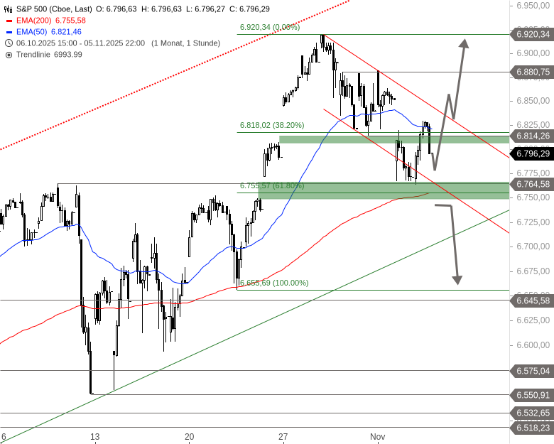 Die Zone um 6.755 Punkte dient weiterhin als Unterstützung und könnte eine Bodenbildung einleiten. Ein erfolgreicher Ausbruch nach oben würde Platz bis etwa 7.000 Punkte schaffen. Kippt der Index dagegen unter die untere Begrenzung des Gaps vom 24. Oktober bei 6.741 Punkten, drohen weitere Abgaben bis 6.655 Punkte.