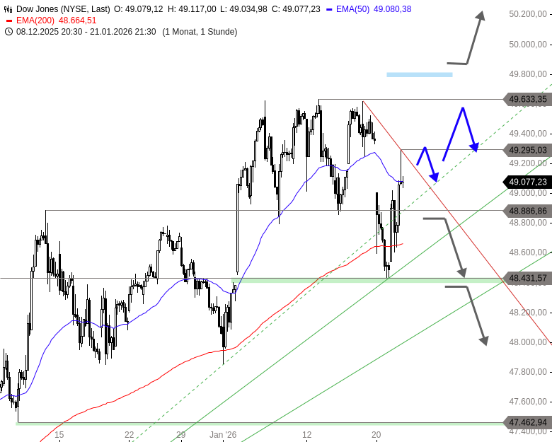 Nach dem Anstieg über 49.020 Punkte haben die Bullen weiter die Chance, den Aufwärtstrend bis 49.295 Punkte fortzusetzen. Sollte der Kurs dort abprallen, könnte ausgehend von 48.886 bis 49.020 Punkten ein weiterer Ausbruchsversuch starten und bei Erfolg Zugewinne bis 49.528 Punkte und das Allzeithoch bei 49.633 Punkten auslösen. Von einer Fortsetzung der Rally bis 50.200 Punkte kann aber erst bei Kursen über 49.800 Punkten ausgegangen werden.