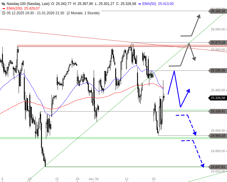 Ein Anstieg über 25.595 Punkte müsste mit einem Sprung über 25.640 Punkte bestätigt werden, um Kurse um 25.800 Punkte zu erreichen.