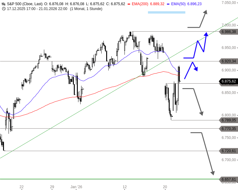 Heute dürfte der nächste Angriff auf das Widerstandsniveau bei 6.920 Punkten starten. Allerdings braucht es einiges an Wucht, um die Hürde in Richtung 6.955 Punkte und darüber an das neue Rekordhoch bei 6.986 Punkten zu durchbrechen. Darüber könnte der Index weiter bis 7.030 Punkte steigen.