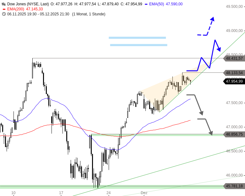 Das Ende des Monats November stand im Zeichen einer impulsiven Konterbewegung, die den Dow Jones Index vom Unterstützungsbereich bei 45.750 Punkten bis fast an das neue Rekordhoch antrieb. Knapp unter dem Freitagshoch bei 48.133 Punkten ging der Index aus dem Handel und dürfte an dieser Stelle heute die Rekordjagd fortsetzen.