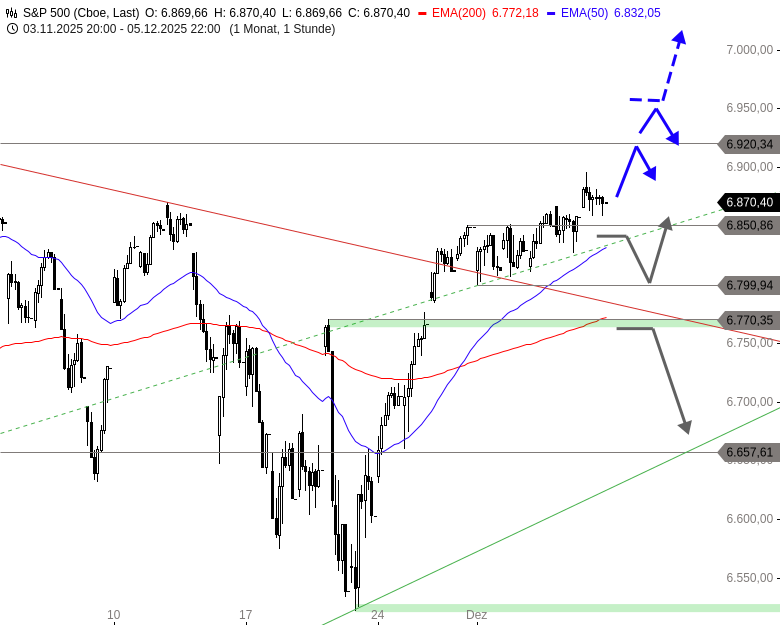 Der S&P 500 Index hat mit dem Anstieg über 6.770 Punkte den Abwärtstrend seit dem Allzeithoch aus dem Oktober gekontert und steht dank des Ausbruchs über 6.850 Punkten vor einem Angriff auf das Rekordhoch bei 6.920 Punkten.