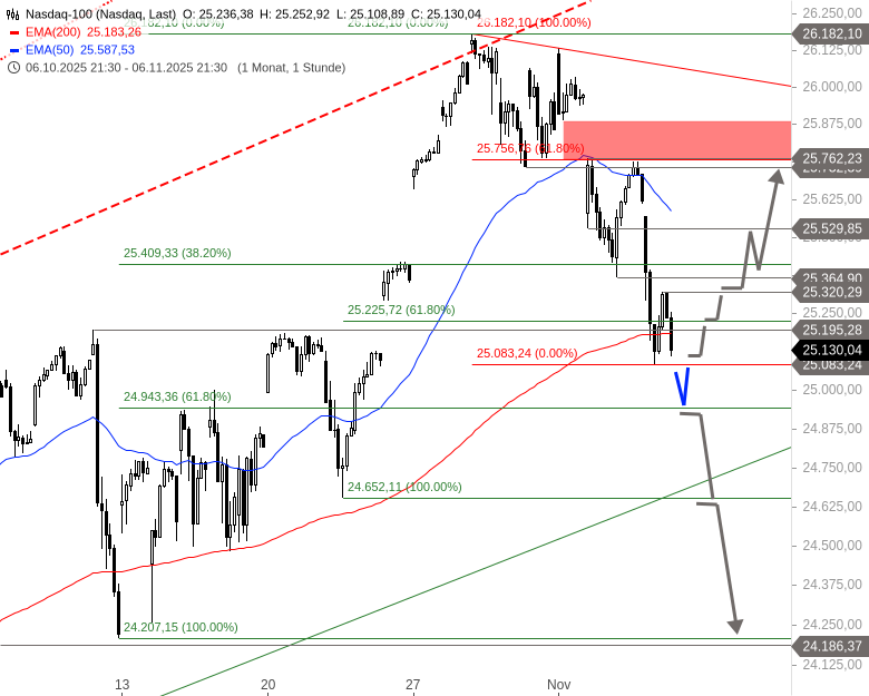 Der Nasdaq 100 geriet gestern nach schwachem Start weiter unter Druck und durchbrach den Zielbereich der Konsolidierung seit dem Allzeithoch bei 25.225 bis 25.195 Punkten. Anschließend stabilisierte er sich kurzfristig und stieg auf 25.320 Punkte, bevor er im späten Handel erneut nachgab. Diese Abgaben setzten sich vorbörslich fort. Um 13:46 Uhr wird der Index bei 24.980 Punkten getaxt, 150 Punkte unter dem Vortagesschluss.