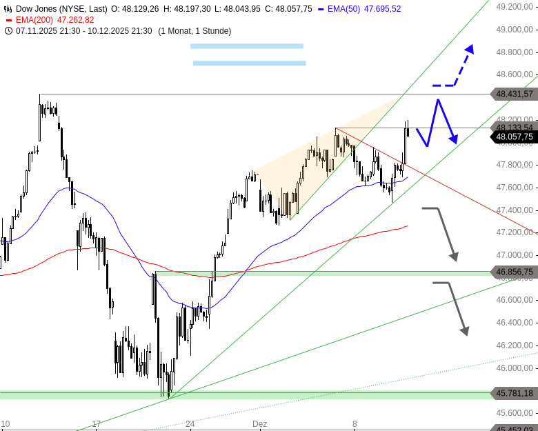 Im gestrigen Handel startete der Dow Jones Index eine Kaufwelle, die schnell über die kurzfristige Abwärtstrendlinie und nach der Veröffentlichung der Fed-Zinssenkung sogar an den Widerstand bei 48.133 Punkten führte. Die nachbörslichen Verluste wurden mittlerweile gekontert.
