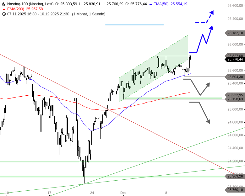 Mit dem Doppelboden bei 25.504 Punkten startete eine weitere Aufwärtstrendphase beim Nasdaq 100 Index, die direkt an den zentralen kurzfristigen Widerstand bei 25.828 Punkten führte. Dort prallte der Index vor allem in der Nachbörse stark nach unten ab, konnte Teile des Abverkaufs jedoch vorbörslich wieder auffangen.
