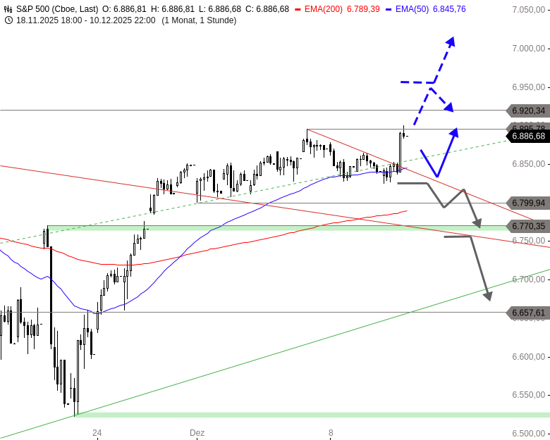Erst ein Anstieg über 6.870 bis 6.895 Punkte dürfte den S&P 500 an das Rekordhoch bei 6.920 Punkte antreiben. Ein kurzer Anstieg über das Hoch dürfte bei 6.950 Punkten eingefangen werden und dort eine Korrektur starten. Oberhalb des Kursziels könnte die Rally aber später schon bis 7.030 Punkte durchstarten.