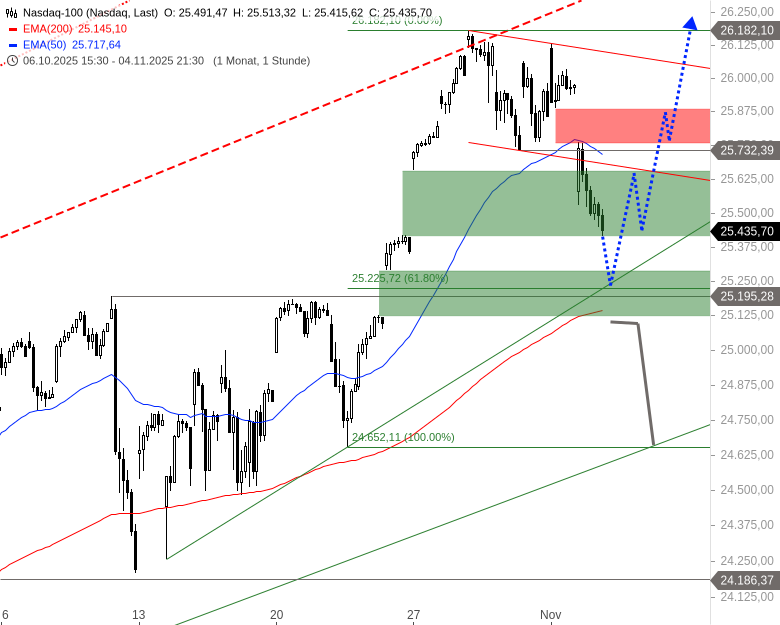 Der Nasdaq 100 eröffnete am Dienstag schwach und fiel zunächst auf 25.529 Punkte zurück. Im Anschluss erholte sich der Index bis zum EMA50 auf Stundenbasis, prallte dort jedoch nach unten ab und schloss das Aufwärtsgap vom 27. Oktober. Im nächtlichen Handel geriet der Index erneut unter Druck und markierte bei 25.154 Punkten ein Tief. Bis 13:23 erholte er sich auf 25.382 Punkte, notierte aber weiterhin unter dem Schlusskurs des Vortags.