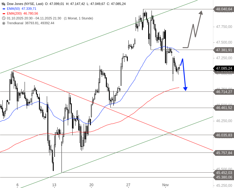 Auch der Dow Jones startete den Handelstag mit Verlusten und fiel zunächst auf 46.877 Punkte. Im Anschluss konnte er sich bis 47.274 Punkte erholen, gab die Gewinne jedoch im Tagesverlauf teilweise wieder ab. Im Gegensatz zum Nasdaq 100 fiel der Dow aber nicht unter sein Eröffnungstief. Nach dem Allzeithoch bei 48.040 Punkten bildete sich ein kleines Doppeltop aus, dessen rechnerisches Kursziel bei 46.731 Punkten noch offen ist.