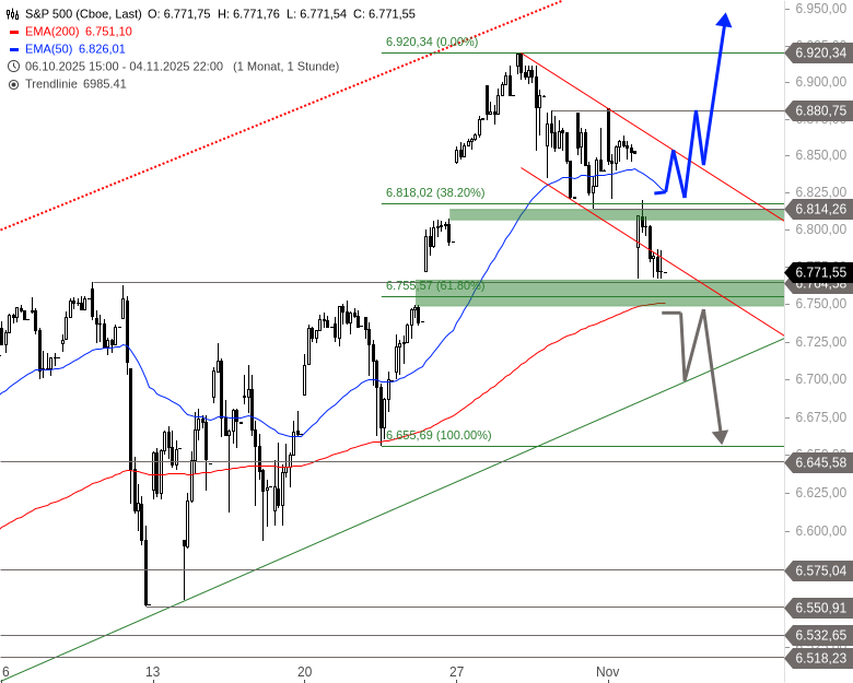 Mit Erreichen der genannten Unterstützungszone könnte die Konsolidierung seit dem Allzeithoch bei 6.920 Punkten bereits abgeschlossen sein. Ein Ausbruch über das gestrige Tageshoch bei 6.820 Punkten wäre ein erstes Signal für eine neue Aufwärtswelle in Richtung der 7.000-Punkte-Marke. Sollte der Index jedoch unter 6.749 Punkte fallen, wäre mit einem Rückschlag bis 6.655 Punkte zu rechnen. Damit bleibt die Lage technisch angespannt.