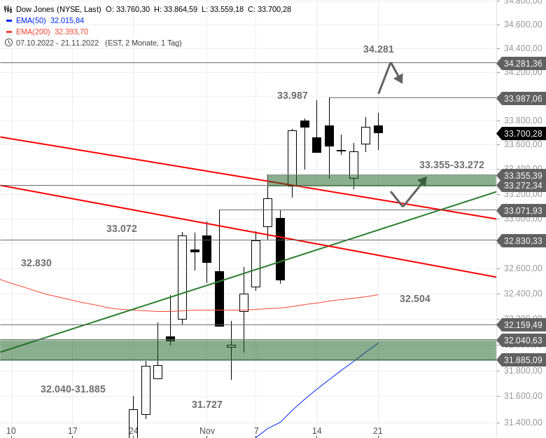 Weiterhin ist der Angriff auf das Hoch bei 33.987 Punkten möglich. Darüber bleibt es beim Ziel in Form des Augusthochs bei 34.281 Punkten. Auf der Unterseite bildet die überwundene Abwärtstrendlinie auch in der neuen Handelswoche einen Support. Darunter könnte der Index Kurse um 32.072 Punkte ansteuern, wo es auch eine Kurslücke im Chart zu schließen gibt.