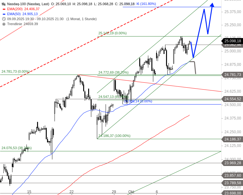 Noch gibt es keinen Anlass, von den Zielen bei 25.422 und 25.847 Punkten abzuweichen. Die gestrigen Gewinnmitnahmen führten nicht zu Verkaufssignalen. Wichtig bleibt kurzfristig der EMA50 (Stundenbasis) bei 24.905 Punkten. Ein stabiler Rückfall darunter wäre ein erstes Warnsignal. In diesem Fall drohen Abgaben in Richtung 24.781 bis 24.772 Punkte.
