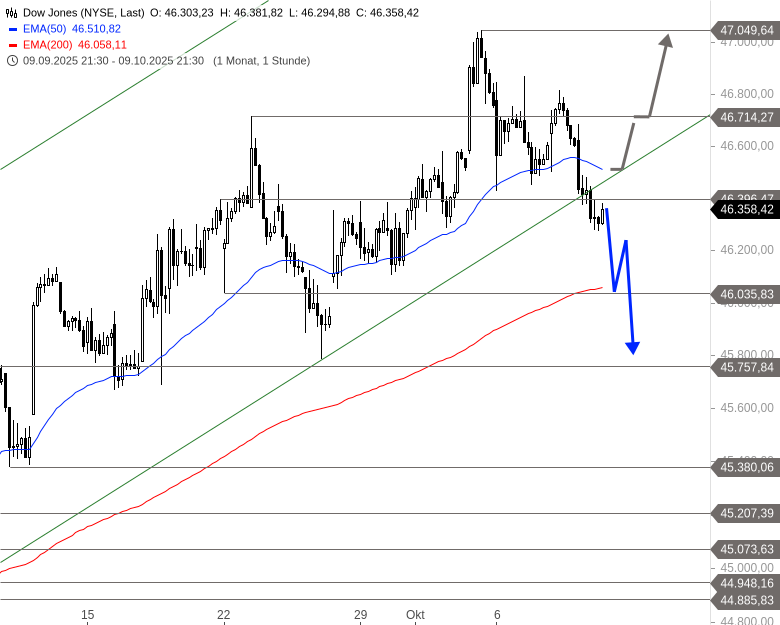 Kurzfristig könnte es zu einer Abwärtsbewegung in Richtung 46.035 und 45.757 Punkte kommen. Ein Rückfall unter 45.757 Punkte dürfte Abgaben bis 45.073 Punkte nach sich ziehen. Ein Anstieg über den EMA50 (Stundenbasis) bei 46.510 Punkten würde das Chartbild leicht aufhellen und einen Anstieg bis 46.714 oder sogar an das Allzeithoch bei 47.049 Punkten ermöglichen.
