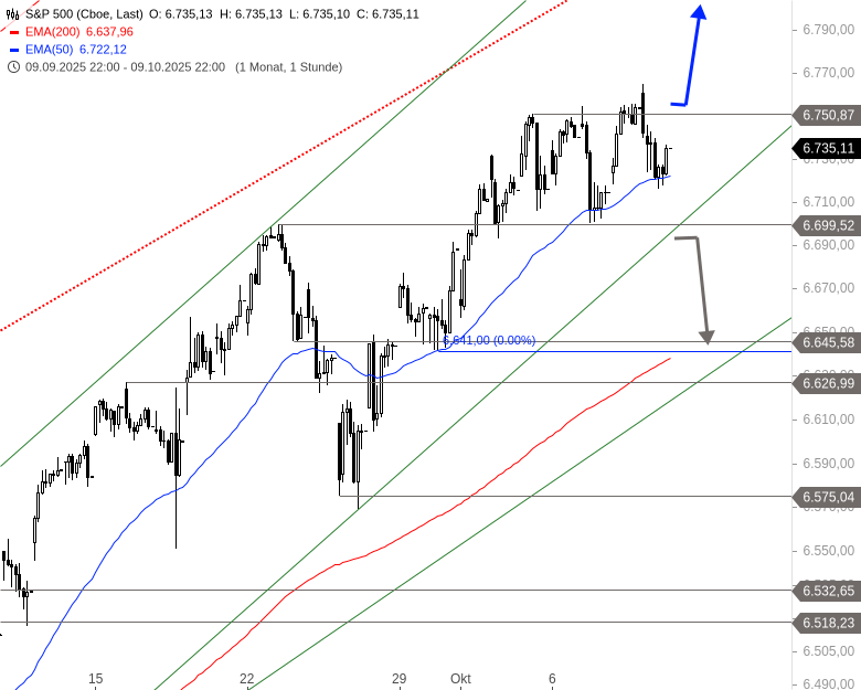 Ein erneuter Anstieg über 6.750 Punkte könnte kurzfristig weiteres Potenzial bis ca. 6.818 Punkte freisetzen. Ein Rückfall unter 6.699 Punkte würde eine kleine Topformation vollenden und Abgaben in Richtung 6.645 bis 6.641 Punkte implizieren.